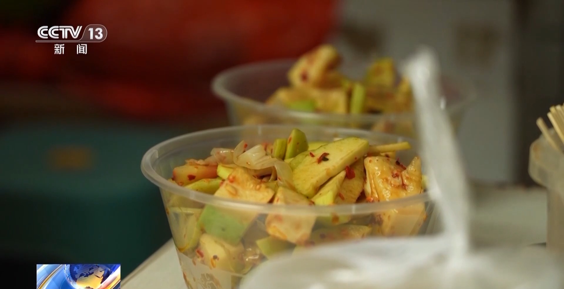 总台记者 杨雪:街头巷尾,最具广西特色的还得是酸嘢,而红糖酸嘢更是将酸、甜、辣、咸完美融合。将新鲜芒果、菠萝、番石榴等食材切块,加入红糖粉和秘制调料均匀搅拌,再根据口味加入辣椒粉,红糖的蜜甜与水果的清甜结合,吃起来别有一番风味。
